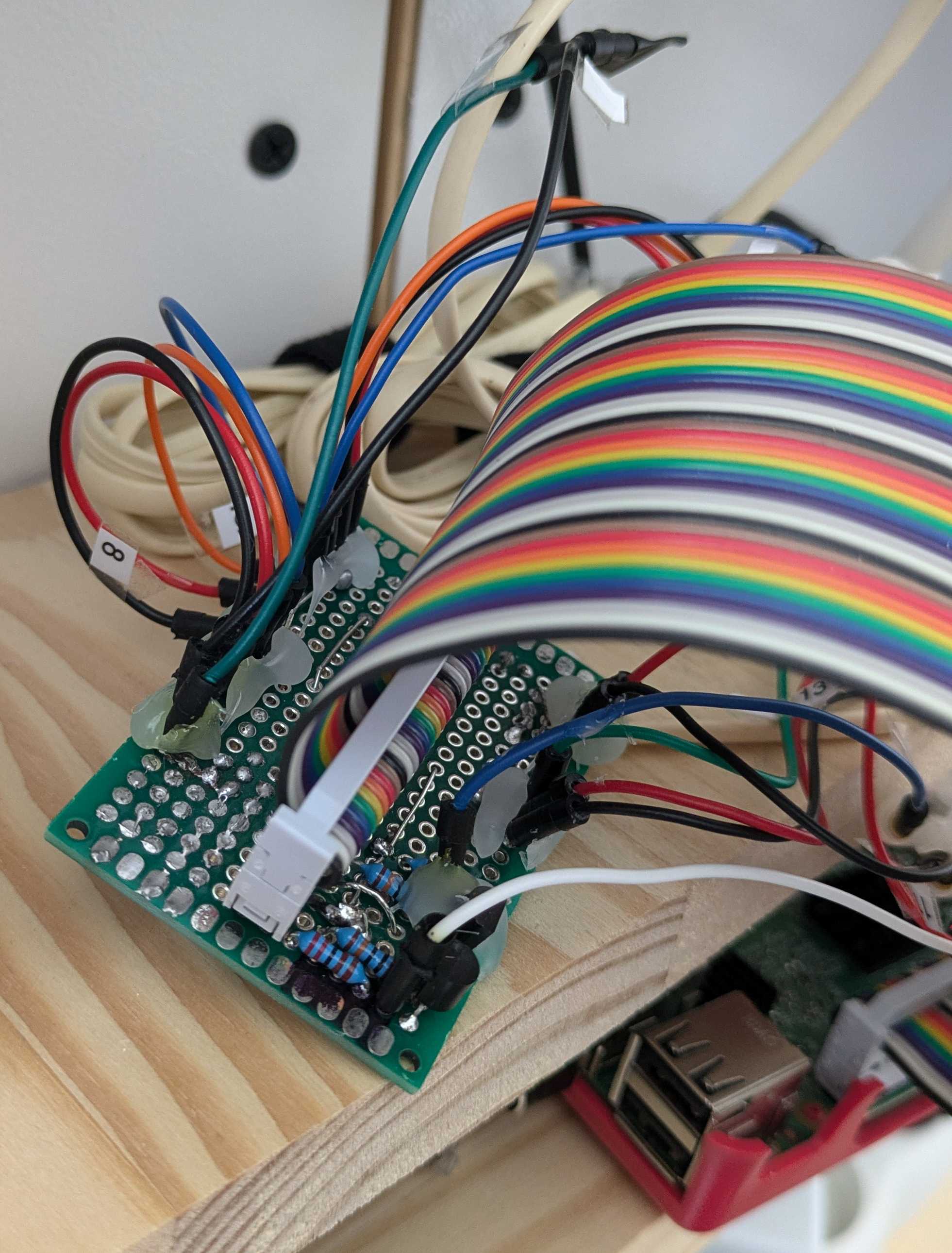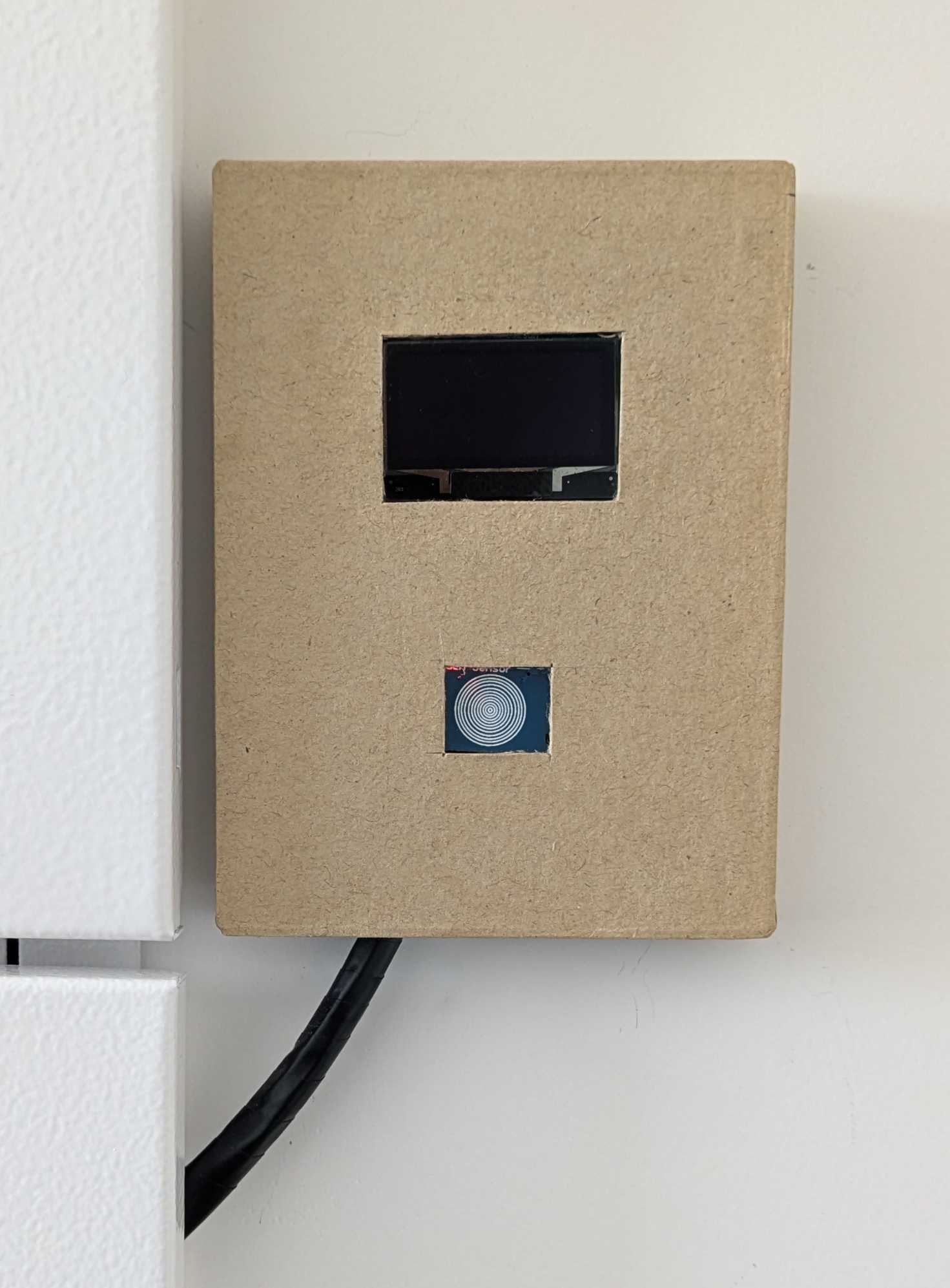 L'installation consiste en une boîte en carton pour l'afficheur et le capteur tactile. Une carte PCB relie les pattes de l'afficheur et du capteur tactile au port GPIO du Raspberry Pi via une nappe.