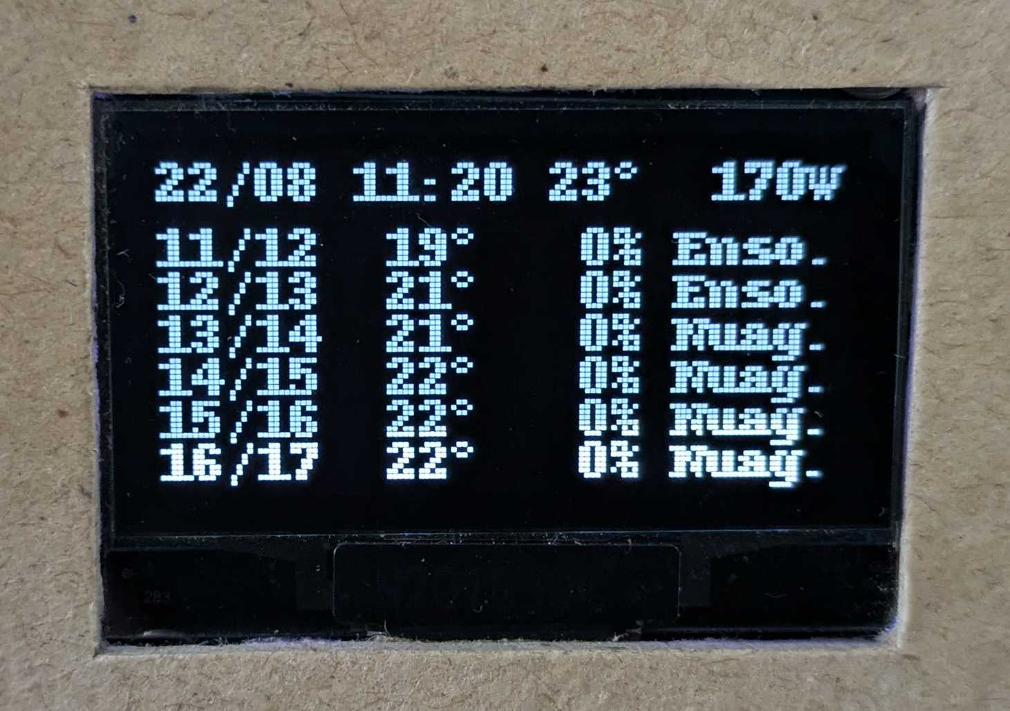 Seul du texte statique est affiché et le nombre de caractères est limité. Il serait possible d'afficher plus de données en ajoutant un déroulement automatique comme le montre cet exemple. Cela permettrait d'afficher plus de créneaux horaires ou plus d'informations par créneau, comme le vent ou l'humidité.